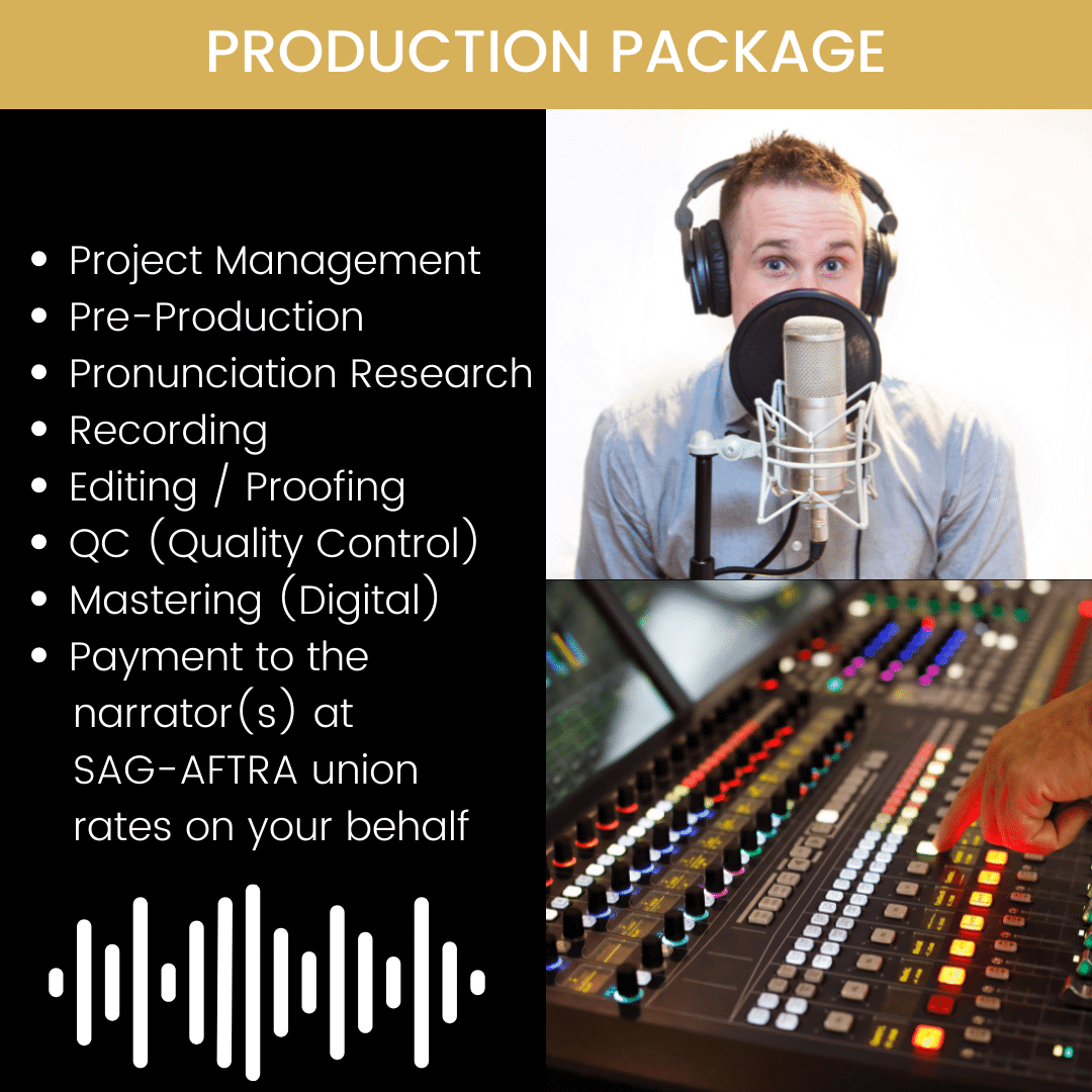 A: We do. We pay the narrator directly for all full productions we produce, and we handle all corresponding paperwork. We pay all narrators’ rates at SAG-AFTRA scale, which includes 13% in addition to their fee for pension and health.